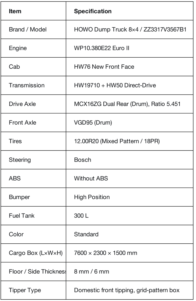 The HOWO Sino Trucks 8x4 is a high-performance heavy-duty truck engineered to tackle the toughest jobs in construction, mining, and bulk material transportation . Powered by a robust, fuel-efficient turbocharged diesel engine (typically 336-420HP) , it delivers exceptional power and torque for demanding conditions . Its 8x4 drive configuration, combined with heavy-duty axles and a reinforced chassis, provides outstanding traction and stability even on rough terrain .
